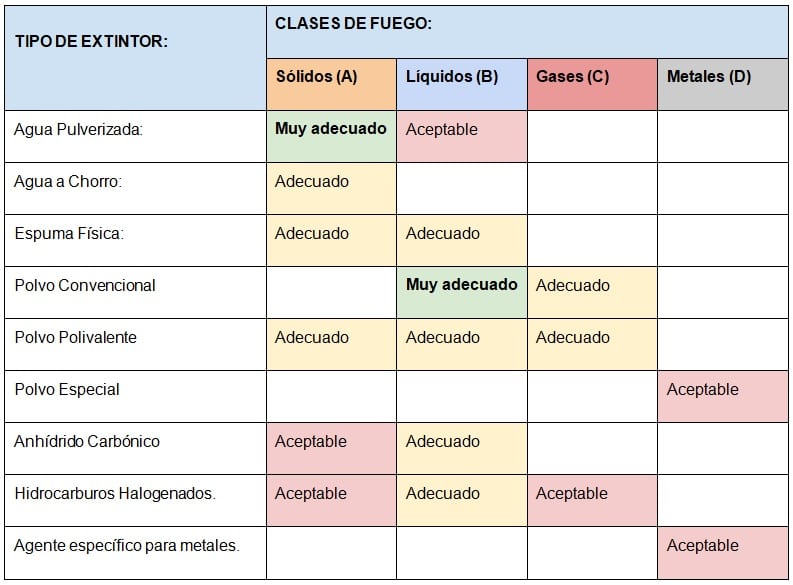 La siguiente tabla se basa en la tabla que aparece en la NTP 28: Medios de extinción, en la que se refleja la idoneidad de los diferentes agentes extintores más comunes y su eficacia en función del tipo de combustible.